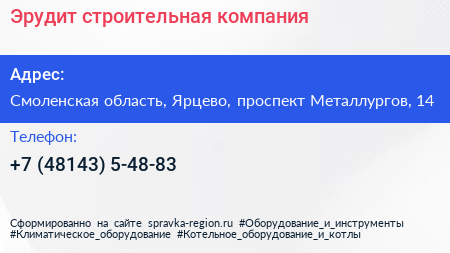 Эрудит, строительная компания по адресу Смоленская область, Ярцево, проспект Металлургов, 14 в дальнейшем Организация, размещена в следующих категориях: