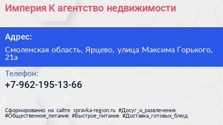Империя-К, агентство недвижимости по адресу Смоленская область, Ярцево, улица Максима Горького, 21а в дальнейшем Организация, размещена в следующих категориях: