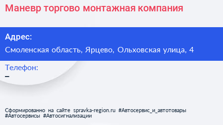 Маневр, торгово-монтажная компания по адресу Смоленская область, Ярцево, Ольховская улица, 4 в дальнейшем Организация, размещена в следующих категориях: