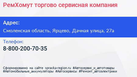 РемХомут, торгово-сервисная компания по адресу Смоленская область, Ярцево, Дачная улица, 27а в дальнейшем Организация, размещена в следующих категориях: