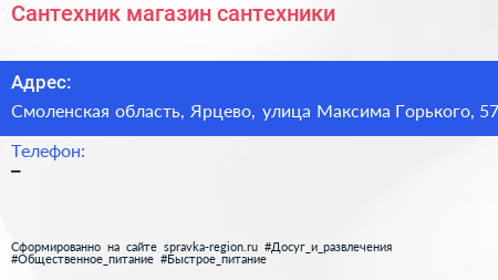 Сантехник, магазин сантехники по адресу Смоленская область, Ярцево, улица Максима Горького, 57 в дальнейшем Организация, размещена в следующих категориях:
