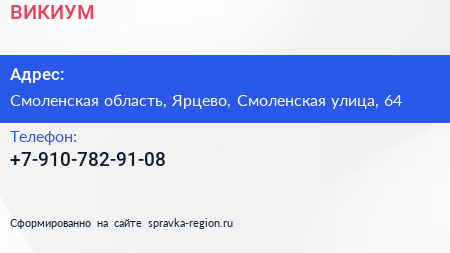 ВИКИУМ по адресу Смоленская область, Ярцево, Смоленская улица, 64 в дальнейшем Организация, размещена в следующих категориях: