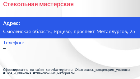 Стекольная мастерская по адресу Смоленская область, Ярцево, проспект Металлургов, 25 в дальнейшем Организация, размещена в следующих категориях:
