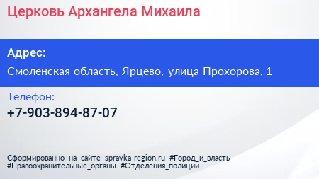 Церковь Архангела Михаила по адресу Смоленская область, Ярцево, улица Прохорова, 1 в дальнейшем Организация, размещена в следующих категориях:
