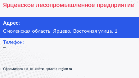 Ярцевское лесопромышленное предприятие по адресу Смоленская область, Ярцево, Восточная улица, 1 в дальнейшем Организация, размещена в следующих категориях: