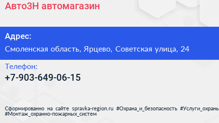 Авто3Н, автомагазин по адресу Смоленская область, Ярцево, Советская улица, 24 в дальнейшем Организация, размещена в следующих категориях: