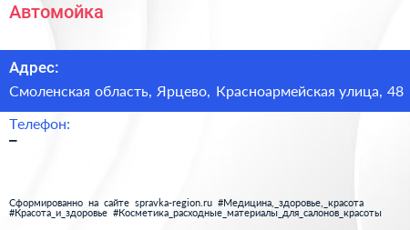 Автомойка по адресу Смоленская область, Ярцево, Красноармейская улица, 48 в дальнейшем Организация, размещена в следующих категориях: