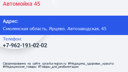Автомойка 45 по адресу Смоленская область, Ярцево, Автозаводская, 45 в дальнейшем Организация, размещена в следующих категориях: