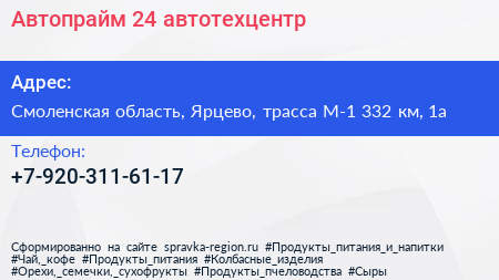 Автопрайм 24, автотехцентр по адресу Смоленская область, Ярцево, трасса М-1 332 км, 1а в дальнейшем Организация, размещена в следующих категориях: