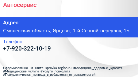 Автосервис по адресу Смоленская область, Ярцево, 1-й Сенной переулок, 1Б в дальнейшем Организация, размещена в следующих категориях: