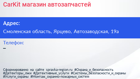 CarKit, магазин автозапчастей по адресу Смоленская область, Ярцево, Автозаводская, 19а в дальнейшем Организация, размещена в следующих категориях: