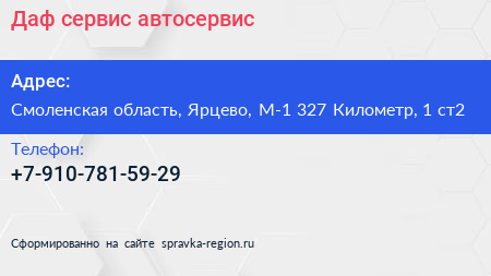 Даф сервис, автосервис по адресу Смоленская область, Ярцево, М-1 327 Километр, 1 ст2 в дальнейшем Организация, размещена в следующих категориях: