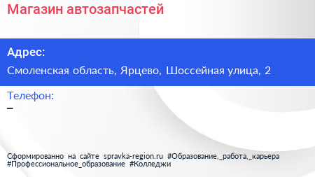 Магазин автозапчастей по адресу Смоленская область, Ярцево, Шоссейная улица, 2 в дальнейшем Организация, размещена в следующих категориях: