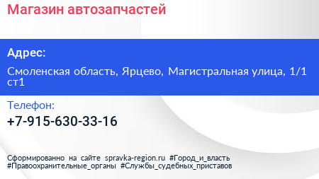 Магазин автозапчастей по адресу Смоленская область, Ярцево, Магистральная улица, 1/1 ст1 в дальнейшем Организация, размещена в следующих категориях: