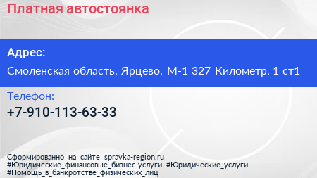 Платная автостоянка по адресу Смоленская область, Ярцево, М-1 327 Километр, 1 ст1 в дальнейшем Организация, размещена в следующих категориях: