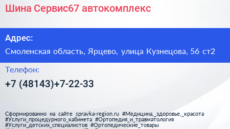 Шина-Сервис67, автокомплекс по адресу Смоленская область, Ярцево, улица Кузнецова, 56 ст2 в дальнейшем Организация, размещена в следующих категориях: