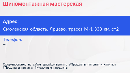 Шиномонтажная мастерская по адресу Смоленская область, Ярцево, трасса М-1 338 км, ст2 в дальнейшем Организация, размещена в следующих категориях: