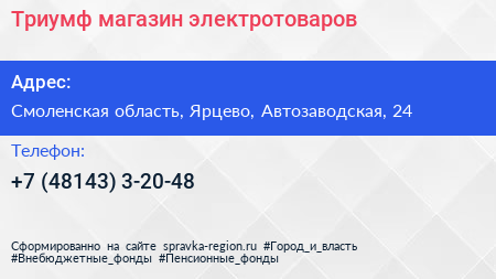 Триумф, магазин электротоваров по адресу Смоленская область, Ярцево, Автозаводская, 24 в дальнейшем Организация, размещена в следующих категориях: