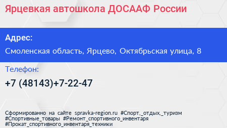 Ярцевкая автошкола, ДОСААФ России по адресу Смоленская область, Ярцево, Октябрьская улица, 8 в дальнейшем Организация, размещена в следующих категориях:
