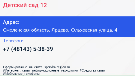 Детский сад №12 по адресу Смоленская область, Ярцево, Ольховская улица, 4 в дальнейшем Организация, размещена в следующих категориях: