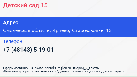 Детский сад №15 по адресу Смоленская область, Ярцево, Старозавопье, 13 в дальнейшем Организация, размещена в следующих категориях: