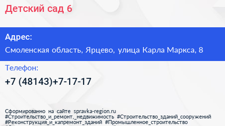 Детский сад №6 по адресу Смоленская область, Ярцево, улица Карла Маркса, 8 в дальнейшем Организация, размещена в следующих категориях: