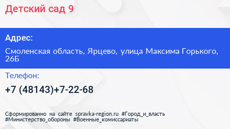 Детский сад №9 по адресу Смоленская область, Ярцево, улица Максима Горького, 26Б в дальнейшем Организация, размещена в следующих категориях: