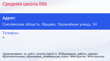 Средняя школа №006 по адресу Смоленская область, Ярцево, Урожайная улица, 14 в дальнейшем Организация, размещена в следующих категориях: