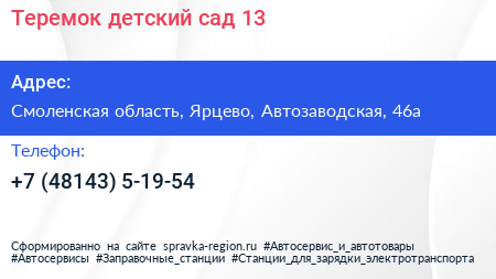Теремок, детский сад №13 по адресу Смоленская область, Ярцево, Автозаводская, 46а в дальнейшем Организация, размещена в следующих категориях: