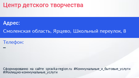 Центр детского творчества по адресу Смоленская область, Ярцево, Школьный переулок, 8 в дальнейшем Организация, размещена в следующих категориях: