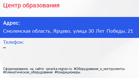 Центр образования по адресу Смоленская область, Ярцево, улица 30 Лет Победы, 21 в дальнейшем Организация, размещена в следующих категориях:
