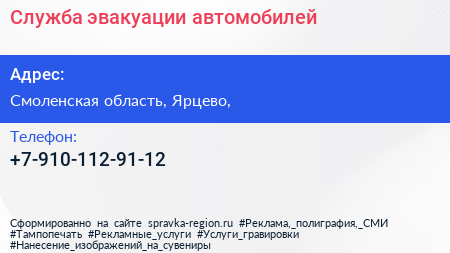 Служба эвакуации автомобилей по адресу Смоленская область, Ярцево, в дальнейшем Организация, размещена в следующих категориях: