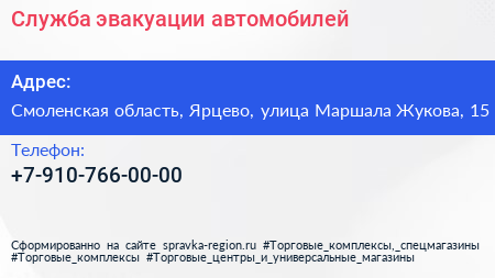 Служба эвакуации автомобилей по адресу Смоленская область, Ярцево, улица Маршала Жукова, 15 в дальнейшем Организация, размещена в следующих категориях: