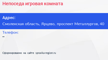 Непоседа, игровая комната по адресу Смоленская область, Ярцево, проспект Металлургов, 40 в дальнейшем Организация, размещена в следующих категориях: