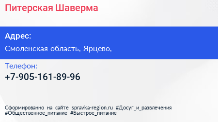 Питерская Шаверма по адресу Смоленская область, Ярцево, в дальнейшем Организация, размещена в следующих категориях: