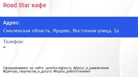 Road Star, кафе по адресу Смоленская область, Ярцево, Восточная улица, 1а в дальнейшем Организация, размещена в следующих категориях: