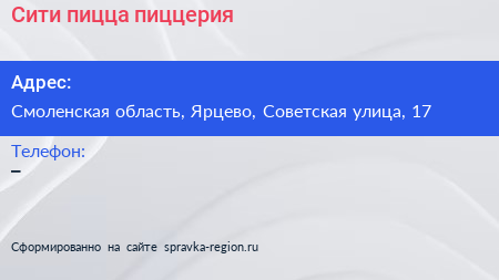 Сити пицца, пиццерия по адресу Смоленская область, Ярцево, Советская улица, 17 в дальнейшем Организация, размещена в следующих категориях: