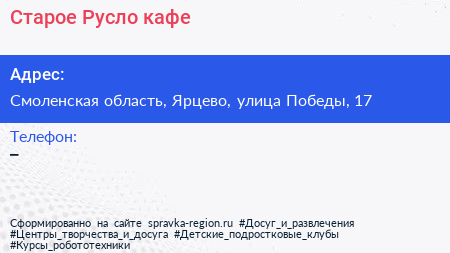 Старое Русло, кафе по адресу Смоленская область, Ярцево, улица Победы, 17 в дальнейшем Организация, размещена в следующих категориях: