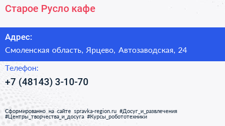 Старое Русло, кафе по адресу Смоленская область, Ярцево, Автозаводская, 24 в дальнейшем Организация, размещена в следующих категориях: