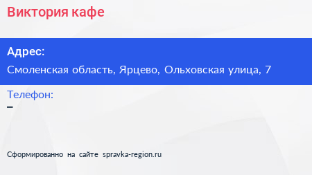 Виктория, кафе по адресу Смоленская область, Ярцево, Ольховская улица, 7 в дальнейшем Организация, размещена в следующих категориях: