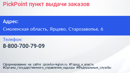 PickPoint, пункт выдачи заказов по адресу Смоленская область, Ярцево, Старозавопье, 6 в дальнейшем Организация, размещена в следующих категориях: