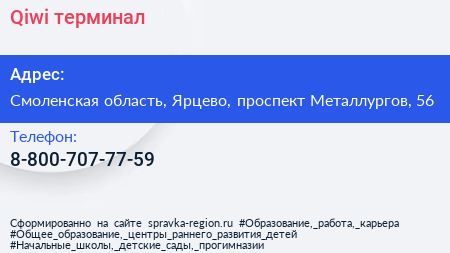 Qiwi, терминал по адресу Смоленская область, Ярцево, проспект Металлургов, 56 в дальнейшем Организация, размещена в следующих категориях: