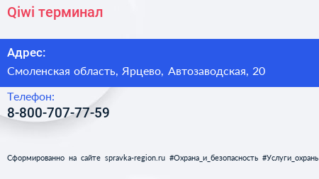 Qiwi, терминал по адресу Смоленская область, Ярцево, Автозаводская, 20 в дальнейшем Организация, размещена в следующих категориях: