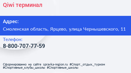 Qiwi, терминал по адресу Смоленская область, Ярцево, улица Чернышевского, 11 в дальнейшем Организация, размещена в следующих категориях: