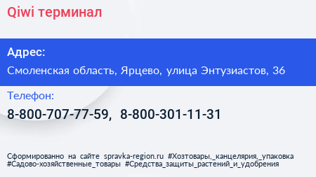 Qiwi, терминал по адресу Смоленская область, Ярцево, улица Энтузиастов, 36 в дальнейшем Организация, размещена в следующих категориях:
