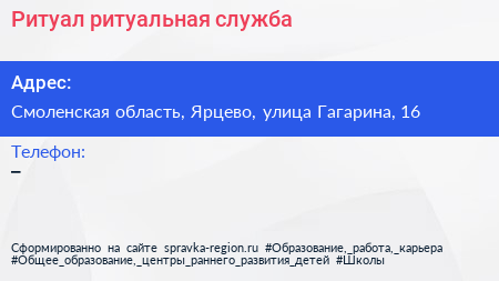 Ритуал, ритуальная служба по адресу Смоленская область, Ярцево, улица Гагарина, 16 в дальнейшем Организация, размещена в следующих категориях: