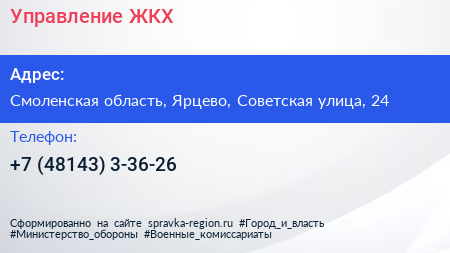 Управление ЖКХ по адресу Смоленская область, Ярцево, Советская улица, 24 в дальнейшем Организация, размещена в следующих категориях: