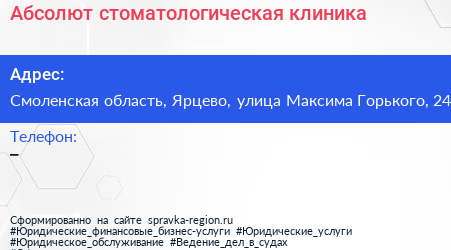 Абсолют, стоматологическая клиника по адресу Смоленская область, Ярцево, улица Максима Горького, 24 в дальнейшем Организация, размещена в следующих категориях:
