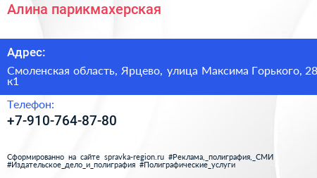 Алина, парикмахерская по адресу Смоленская область, Ярцево, улица Максима Горького, 28 к1 в дальнейшем Организация, размещена в следующих категориях: