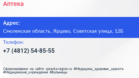 Аптека по адресу Смоленская область, Ярцево, Советская улица, 12Б в дальнейшем Организация, размещена в следующих категориях:
